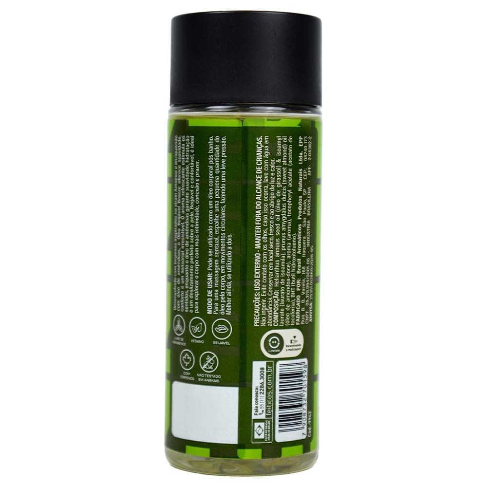 O óleo corporal beijável com terpenos da Feitiços foi desenvolvido para quem deseja transformar o toque em uma experiência mais intensa, fluida e cheia de sensações. Sua combinação de ativos naturais e tecnologia sensorial proporciona um deslizamento perfeito aliado a um toque nutritivo e sedutor.